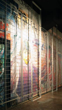 For the Tacheles building, System Wall was realized with metal mesh panels, allowing the listed graffiti to remain visible.