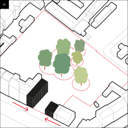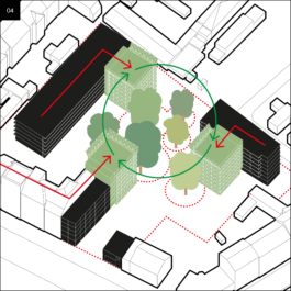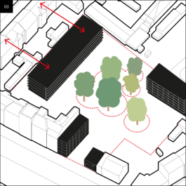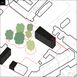 The proposal is developed from three simple settings that relate to the urban context: the extension to the Volkshaus and the adjacent villa create an entrance situation for the campus, a simple housing slab completes the perimeter of the residential structures on the opposite side of the campus, and a profoundly rational office structure in the south mirrors the opposite block edge. Each of those buildings is complemented with a garden house – three almost identical volumes, with a nine-square grid-layout and a green facade, which turn the central garden of the campus into a three-dimensional green space.